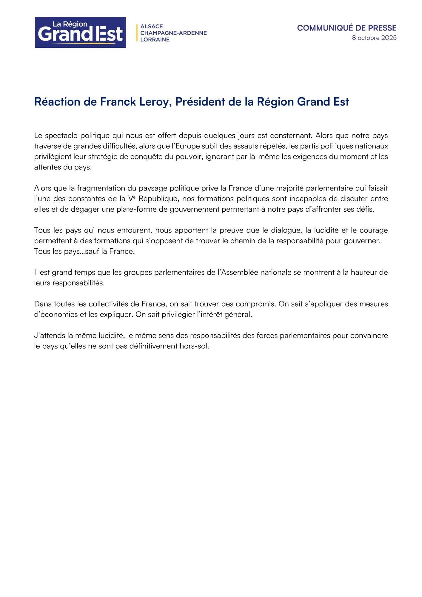 Dans un communiqué diffusé ce mercredi, Franck Leroy, président de la Région Grand Est, a réagi à la situation politique nationale en dénonçant un « spectacle consternant » et un manque de responsabilité des partis politiques. Selon lui, alors que la France traverse une période difficile, les formations nationales seraient davantage guidées par leur stratégie de pouvoir que par les besoins du pays.