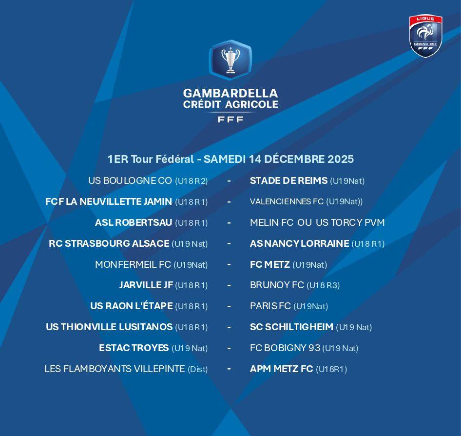 La Fédération Française de Football a effectué ce jeudi à Paris le tirage au sort du 1er tour fédéral de la Coupe Gambardella-Crédit Agricole 2025-2026. Cette étape marque l’entrée en lice des 55 équipes de niveau national, qui rejoignent les 72 clubs qualifiés lors de la phase régionale. Parmi les affiches dévoilées pour les rencontres du 14 décembre, l’US Raon-l’Étape, dernier représentant vosgien encore en course, recevra le Paris FC.