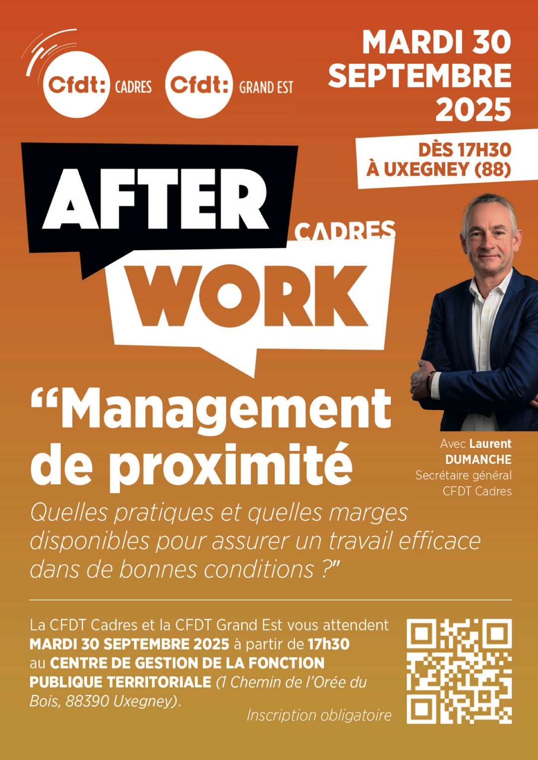 La CFDT Cadres et la CFDT Grand Est donnent rendez-vous à leurs adhérents le mardi 30 septembre à Uxegney pour un afterwork consacré au management de proximité.