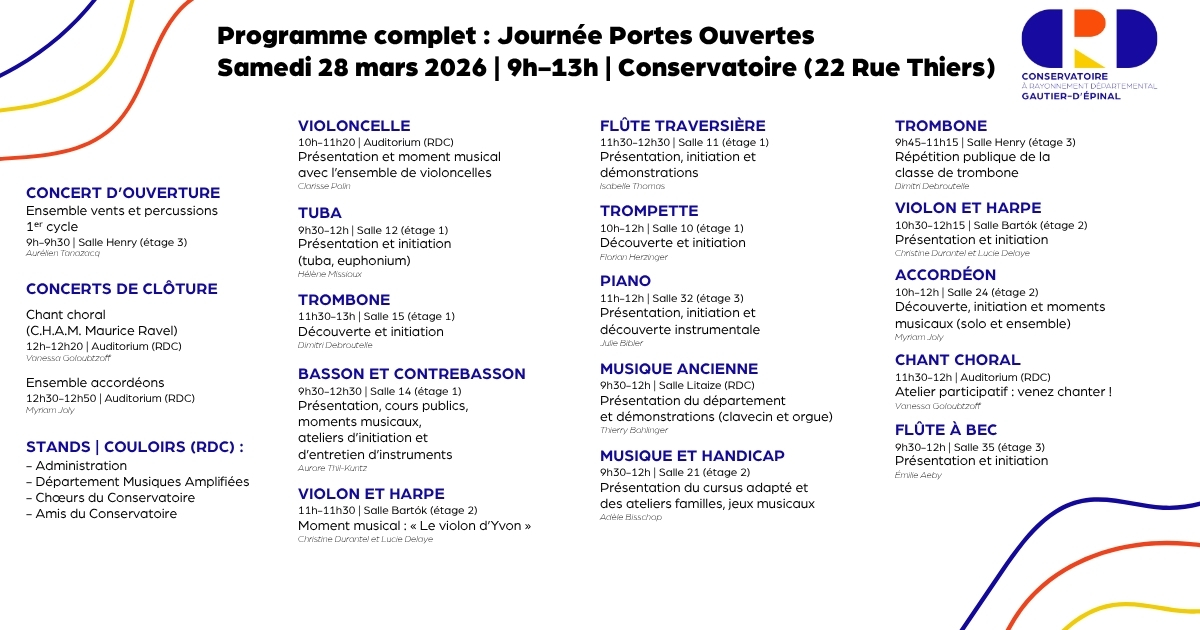 Le samedi 28 mars 2026, de 9h à 13h, le site situé 22 rue Thiers à Épinal ouvre ses portes. Le communiqué invite à « entrer dans l’univers du Conservatoire » et à découvrir « la richesse de nos enseignements, de la musique et de l’art dramatique ».