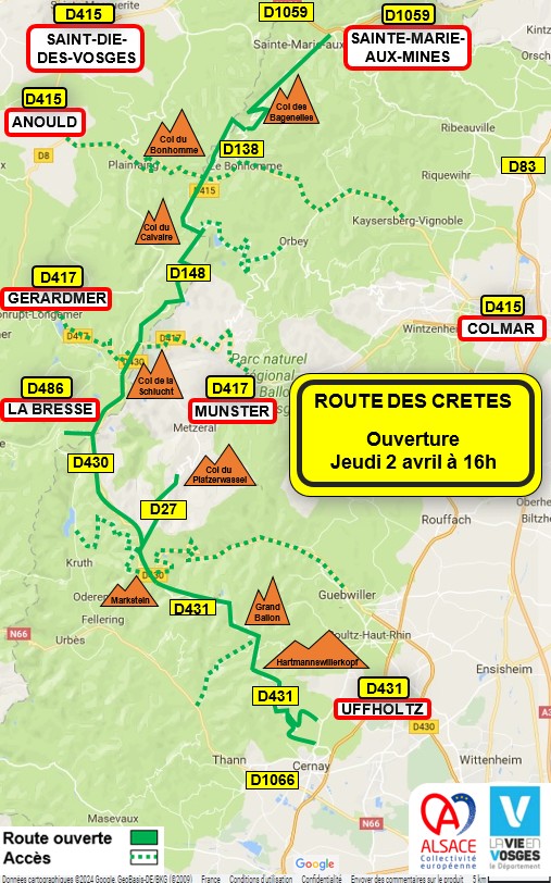Dans un communiqué de presse daté du 27 mars, la Collectivité européenne d’Alsace et le Département des Vosges annoncent la réouverture de la route des Crêtes jeudi 2 avril à 16h. Cette remise en circulation concerne l’axe reliant le Grand Ballon au Col des Bagenelles.