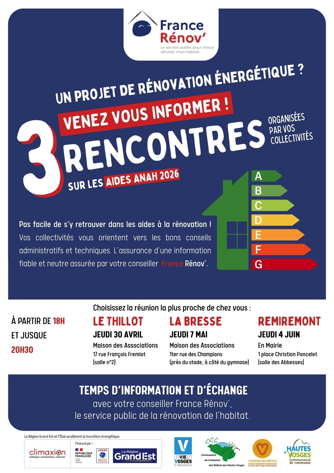 France Rénov’ et les collectivités locales organisent trois réunions dans les Vosges pour informer le public sur les aides à la rénovation en 2026.