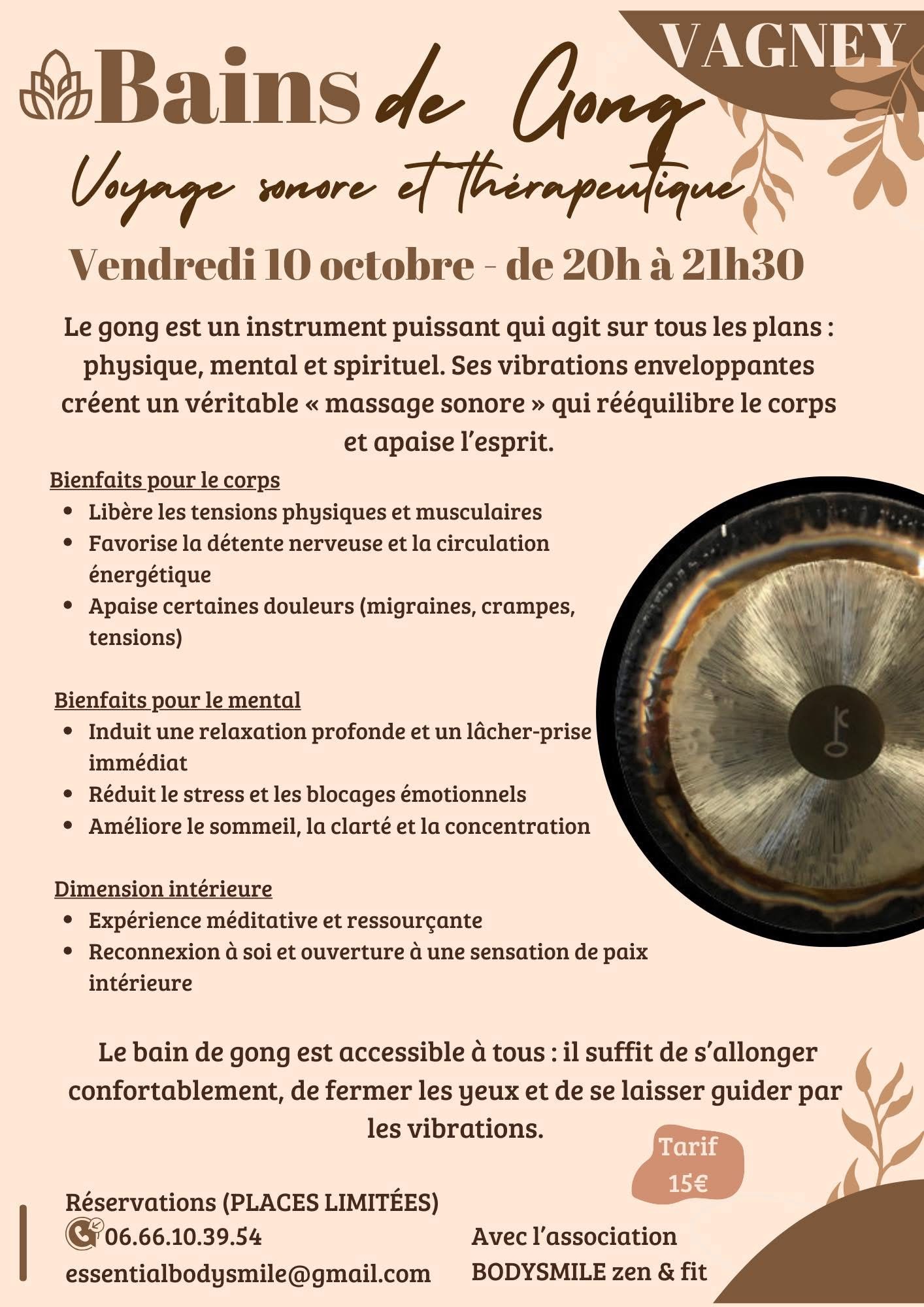 Moment phare de cette rentrée, un Bain de Gong sera organisé le vendredi 10 octobre de 20h à 21h30 à la salle polyvalente de Vagney. Cette expérience sonore, véritable massage vibratoire, apporte une profonde détente. Les bienfaits sont multiples : réduction du stress, amélioration du sommeil, libération des tensions et recentrage intérieur. Une deuxième séance est déjà prévue le 21 novembre.