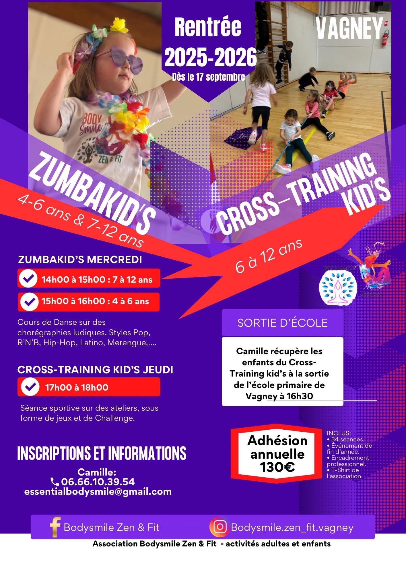 - Zumba Kids pour les 4-6 ans et 7-12 ans, avec des chorégraphies ludiques sur des musiques actuelles.