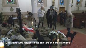 L'enfant Jésus reposera sur un lit de gravats. Et une fresque géante habille le chœur de l'église pour évoquer les conflits dans le monde mais aussi les conflits personnels et intérieurs.