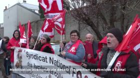 - Une mobilisation intersyndicale a rassemblé ce mercredi matin à Épinal une quarantaine de personnes devant la Direction vosgienne des services de l’Éducation nationale. En ligne de mire : la suppression annoncée en septembre de 37 postes en primaire, et dans les collèges l’équivalent de 25 postes, 30 dans les lycées généraux et technologiques.